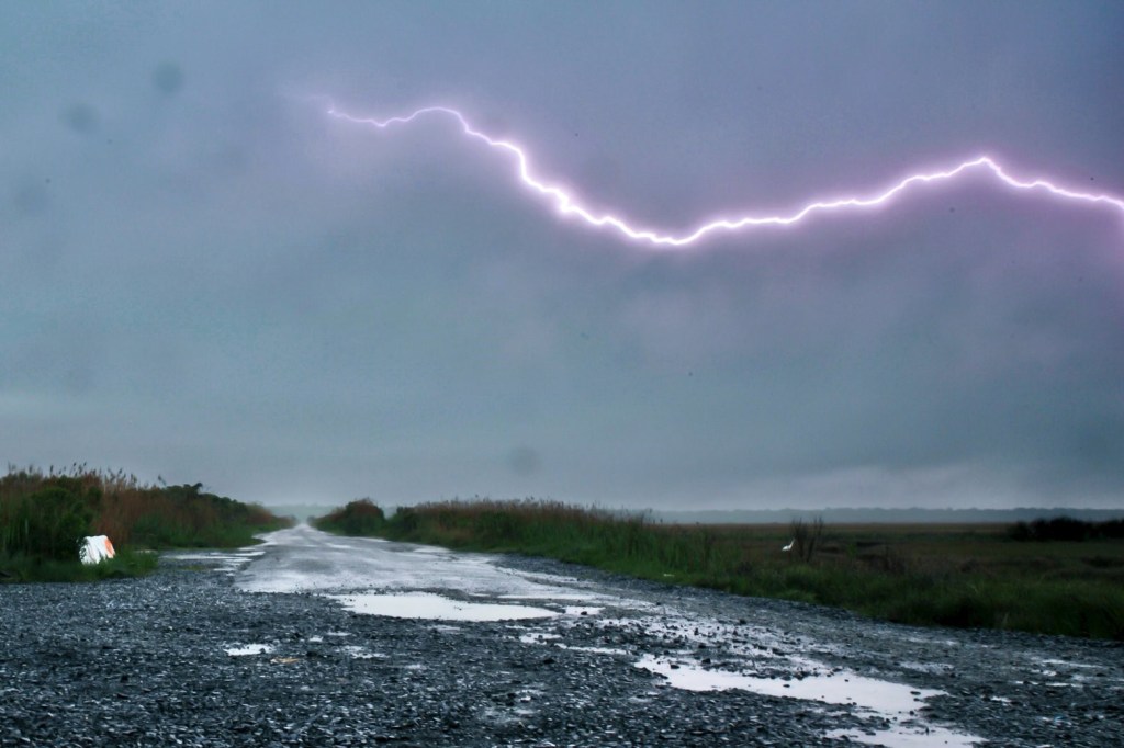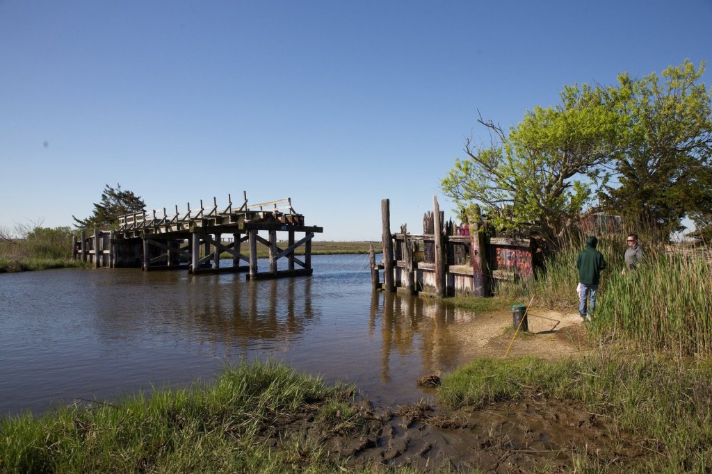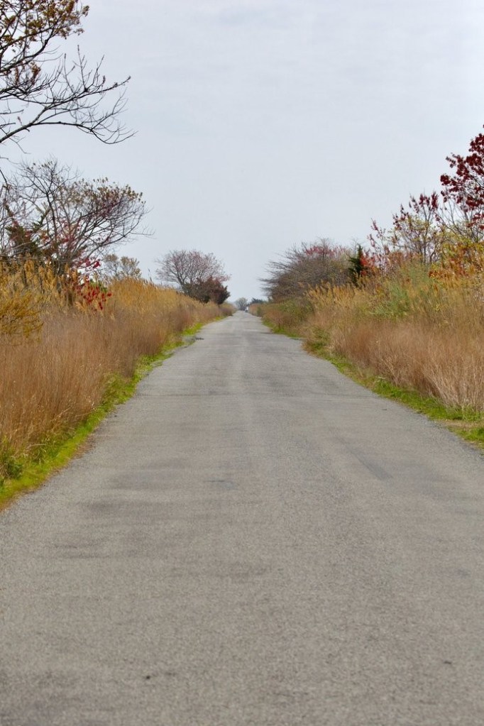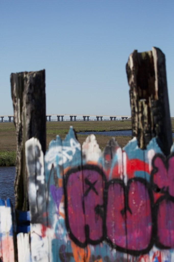 From her cross, the crumbling strand of pavement runs straight through the estuary, waterways to either side of the marsh beyond peeking reeds. Everything above is sky until you slow at the end, where a low rise hoists a narrow, half-section of wooden bridge into the air, bird-dogging toward Long Beach Island (LBI) out distant.