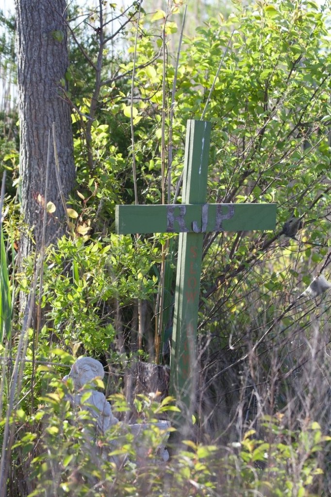 YOU KNOW YOU’RE ON the right dead-end road when you pass Jennifer Lynn Russo’s cross. On the left side of the marshes, its slender green wooden arms blending into the foliage, marking the moment in ’95 where the car went into the creek, killing the 17-year-old. Russo’s cross has always been part of my landscape: My first drive back here would have been a year or two later.