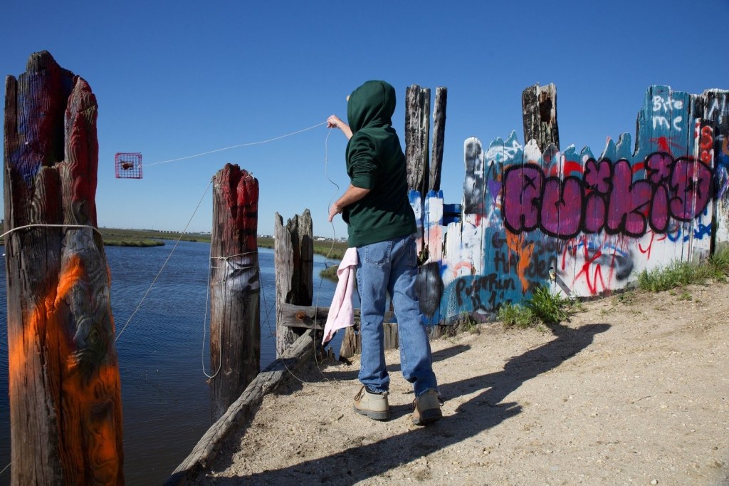 When we get out there one April morning, to gather material for this photo essay, Michael and I wonder if anyone will be around. The bridge these days draws a constant, low-grade trickle of folks. Crabbers, fishers, kayakers, smokers, people in beat-up trucks with large dogs, young lovers.